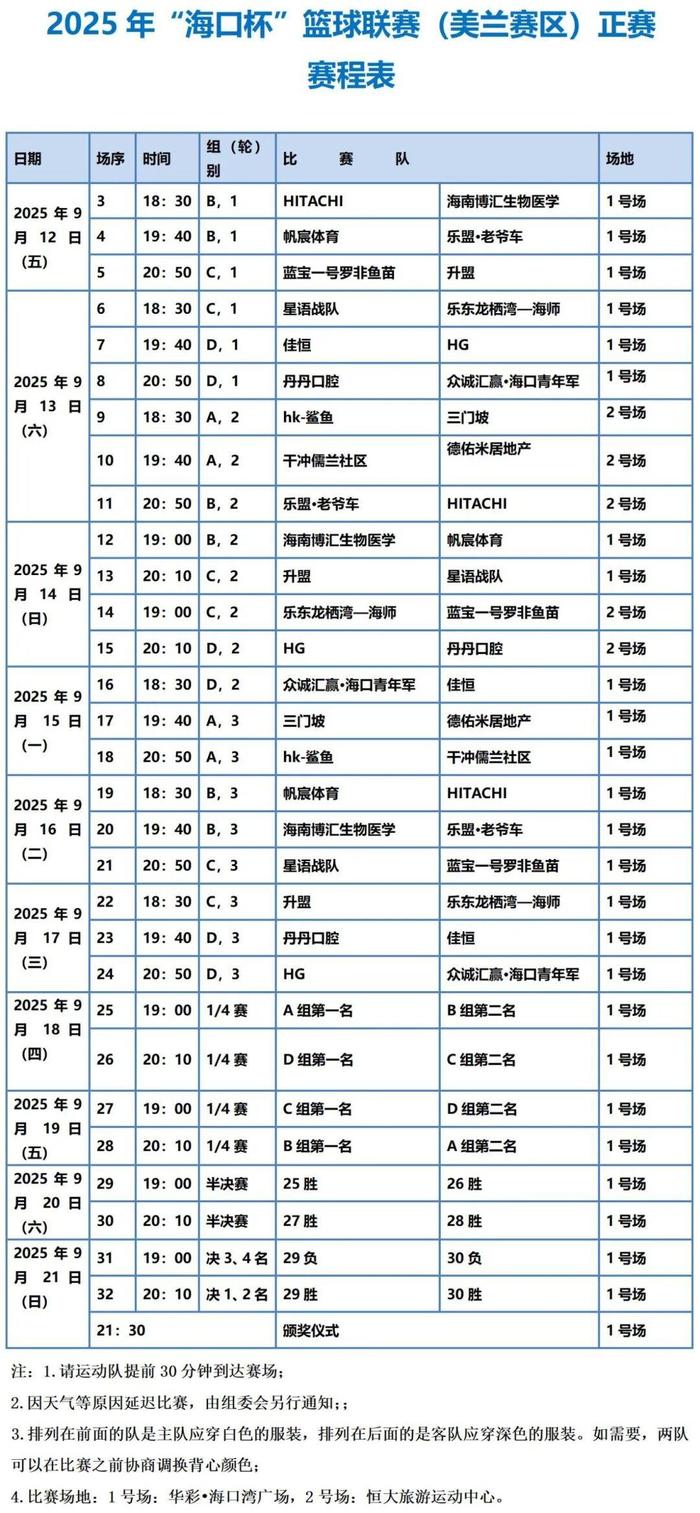 附:2025“海口杯”篮球联赛美兰赛区正赛赛程表