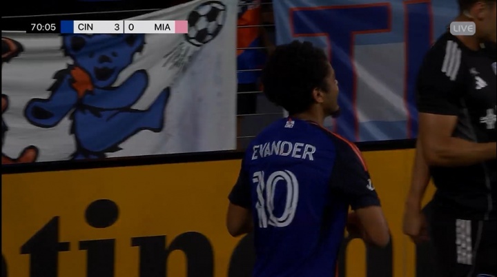 07月17日讯 美职联迈阿密国际客战辛辛那提FC。比赛第70分钟,迈阿密国际3球落后!埃万德补射本场双响,辛辛那提锁定胜局。